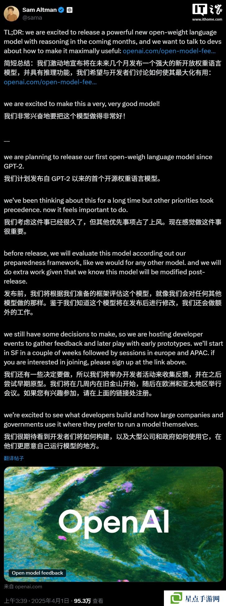 本站 4 月 1 日消息,OpenAI CEO萨姆・奥尔特曼今日官宣,将在未来几个月发布一个“强大的新开放权重语言模型”,并具有推理功能。