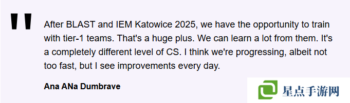 “在2025 BLAST 赏金赛S1和IEM 卡托维兹站之后,我们有机会与顶级战队一同训练。这是一个巨大的优势。我们能从他们身上学到很多东西。这是完全不同水平的CS比赛。我认为我们在进步,虽然速度不算太快,但我每天都能看到提升。”