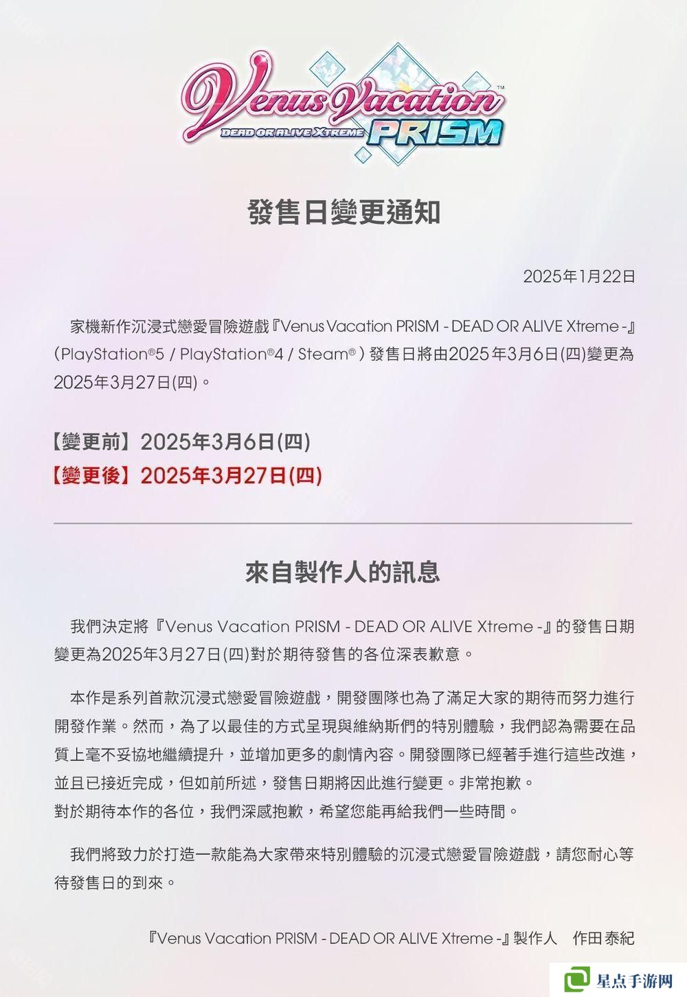 本作原定于今年 3 月 6 日上市,而今日稍早官方宣布将延期至 3 月 27 日,并对此表达歉意。声明中指出:「本作是该系列首款恋爱冒险游戏,我们一直在努力呈现令玩家满意的内容,而为了以最佳的方式呈现与维纳斯们的特别体验,我们需要毫不妥协地提高游戏品质并增加更多剧情。开发团队已着手进行,并已接近完成,但如前述,游戏发售日期将因此变更。我们对此深感抱歉,希望玩家能再耐心等待一段时间。我们将致力于打造一款身歷其境的浪漫冒险游戏,请耐心等待游戏发售日的到来。」
