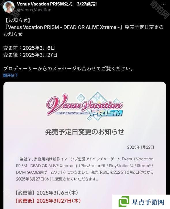 光荣特库摩宣布,沉浸式恋爱冒险游戏《生死格斗:沙滩排球 维纳斯璀璨假期(Venus Vacation PRISM - DEAD OR ALIVE Xtreme -)》将延期至 3 月 27 日发售。