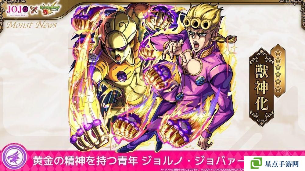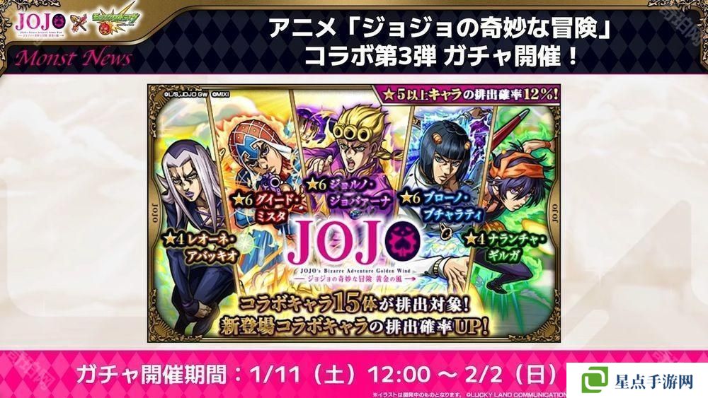 动画《JOJO 的奇妙冒险》合作活动第三弹转蛋将于 1 月 11 日(六)~2 月 2 日(日)期间内登场,「★6 乔鲁诺·乔巴拿」、「★6 布鲁诺·布加拉提」、「★6 葛德·米斯达」、「★4 雷奥·阿帕基」、「★4 纳兰迦·吉尔各」等新登场合作角色的出现机率 UP。
