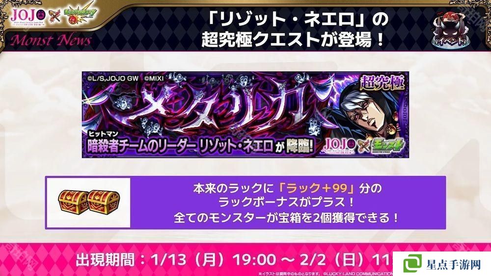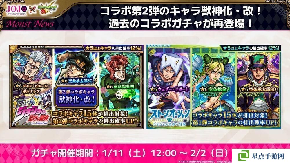 株式会社 MIXI 所推出的一拉一放战斗 RPG 手机游戏《怪物弹珠》日版于今日播出的情报节目中,宣布《怪物弹珠》决定于 1 月 11 日(六)与《JOJO 的奇妙冒险》展开第三次合作,并释出详细活动资讯。