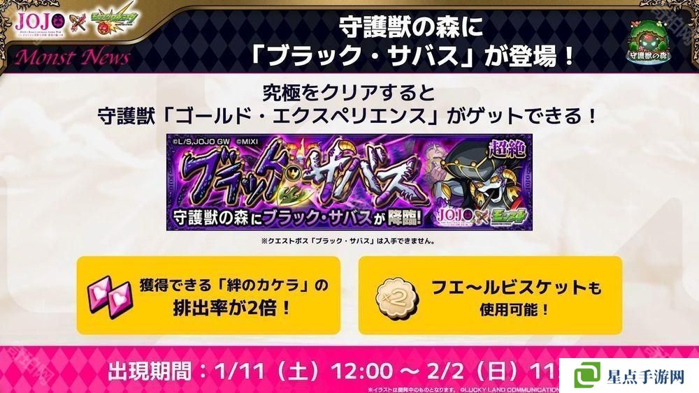 全新「守护兽之森」冒险「黑色安息日」将于 1 月 11 日(六)~2 月 2 日(日)期间内登场登场。成功完成「究极」难易度的冒险的话,能够让守护兽「黄金体验」成为同伴。此外,《JOJO 的奇妙冒险》过去的「守护兽之森」冒险将復刻登场。