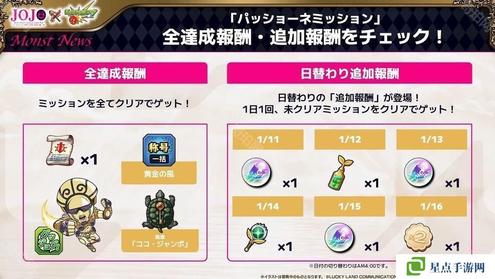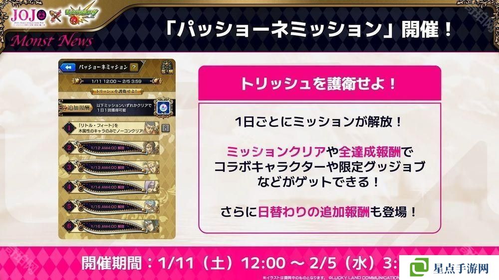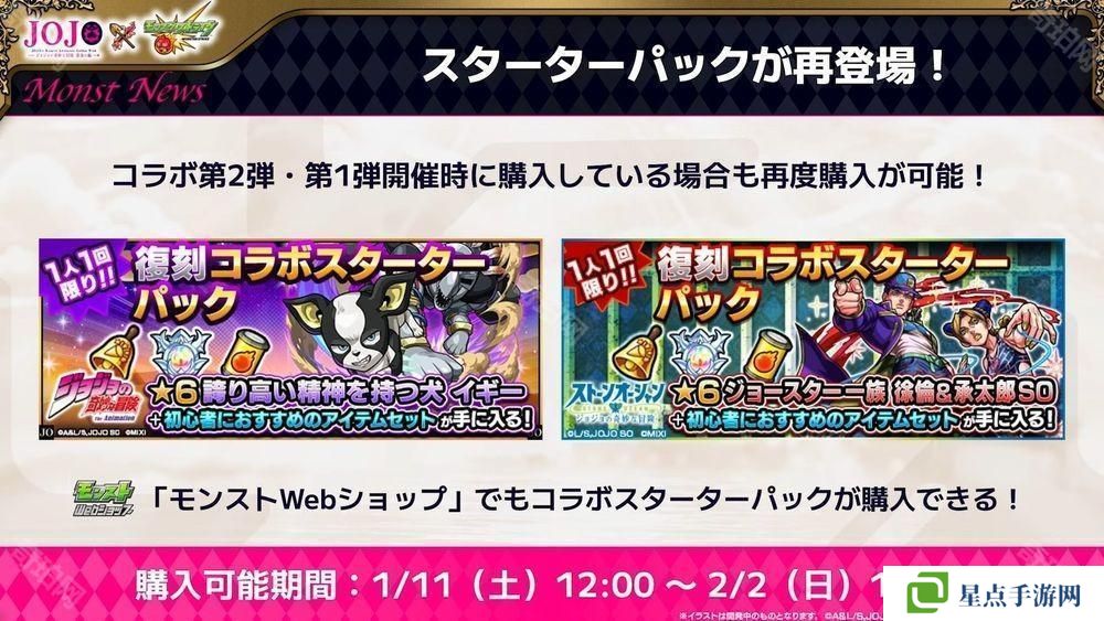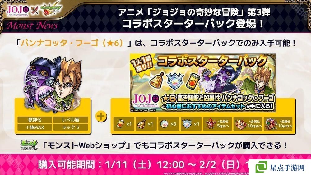 动画《JOJO 的奇妙冒险》合作活动第三弹新手礼包将于 1 月 11 日(六)~2 月 2 日(日)期间内贩售。「★6 潘纳科达·福葛」仅能透过新手礼包入手。