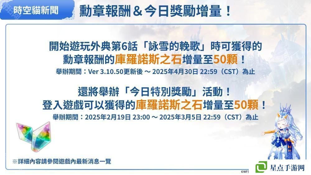 2025 年 2 月 21 日 23:00 至 2025 年 2 月 22 日 22:59(CST)为止,为庆祝日本猫咪日,限定 24 小时除了「今日奖励」以外,还会额外发放「今日特喵奖励」的库罗诺斯之石 220 颗。