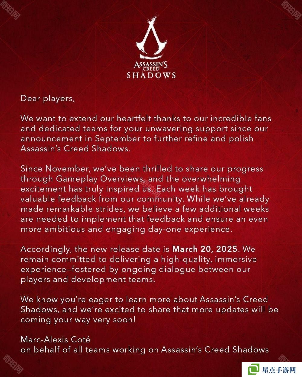 《刺客信条:影》延期至 2025 年 3 月 20 日于 Xbox Series X|S / PS5 / PC 平台发售。
