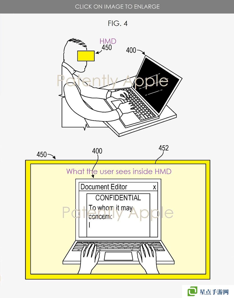 系统会让设备屏幕对外显示空白,所有内容仅通过 AR 设备呈现。专利图 4 以 MacBook 为例演示:用户佩戴头戴系统#450 时,仅能通过其显示屏#452 查看并编辑机密文件,物理屏幕上的内容对旁观者完全隐藏。本站附上相关图片如下: