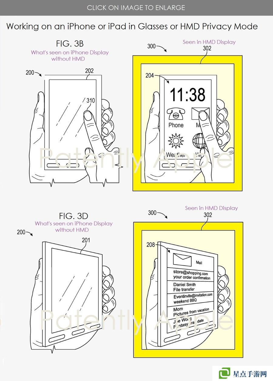 专利图 3B 进一步说明,头戴系统#300 通过半透明显示屏叠加虚拟界面,实现 iPhone / iPad 等设备(#200)的隐私操作。