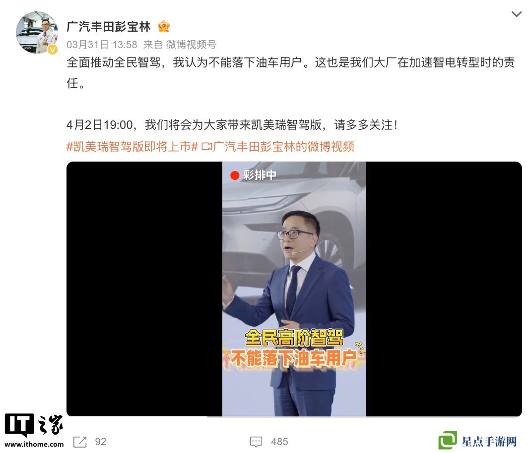 本站4 月 1 日消息,广汽丰田凯美瑞智驾版将于明天(4月 2日)正式上市,官方今天宣布该车将搭载“高阶智驾”系统,预计为 L2 级别辅助驾驶,作为比较,目前在售的广汽丰田凯美瑞搭载 Toyota Pilot 辅助系统,指导价 17.18 万-25.98 万元。