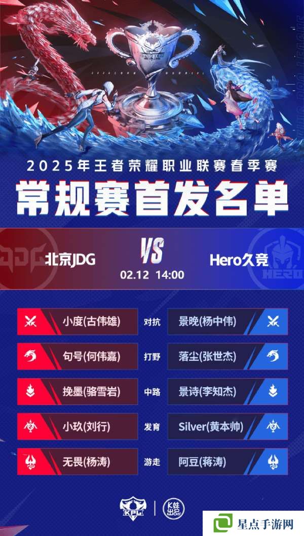 春季赛揭幕战将由北京JDG王者荣耀分部 对阵到Hero久竞 ,经历了转会期的人员变动,北京JDG强势引入的选秀大会状元JDG句号 (何伟嘉)将在赛场上留下怎样的精彩操作?JDG-小度 (古伟雄)JDG挽墨 (骆雪岩)与佛山DRG_阿豆 (蒋涛)赛场再度见面却变成对手,谁能带领队伍拿下上海新主场首战的胜利?