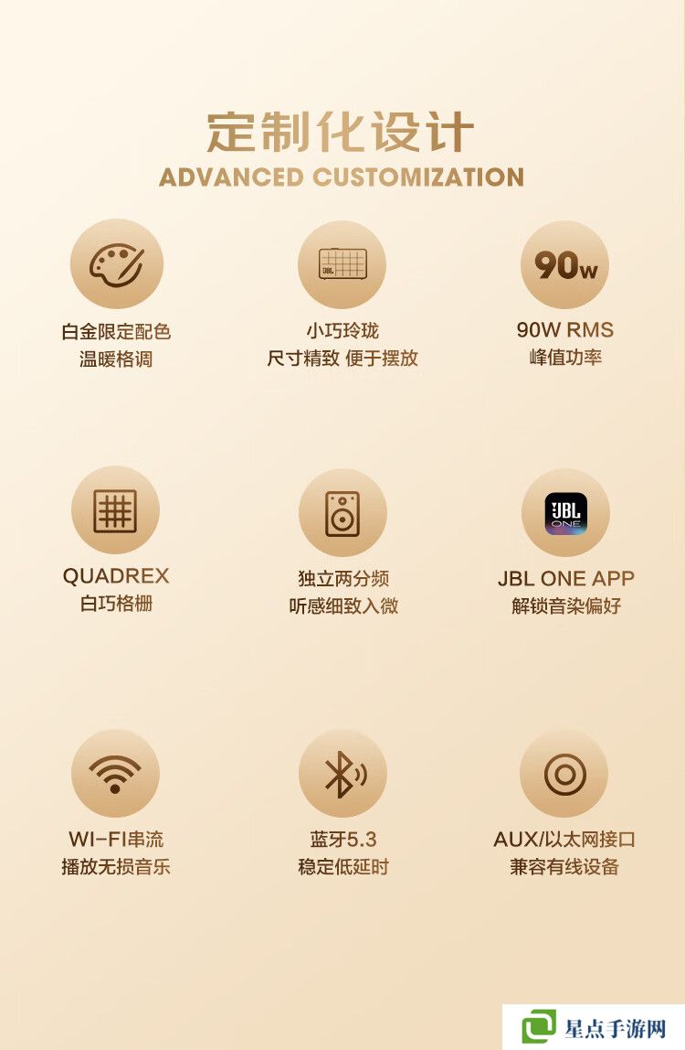 该音箱拥有白金限定配色,采用了源自 JBL L100 CLASSIC 的经典 QUADREX 格栅,内置二分频独立扬声单元,包括 5 英寸长冲程全频单元及两个 25mm 绢丝弧顶单元,还配有 6 英寸赛道型被动振膜,总功率可达 90W RMS。