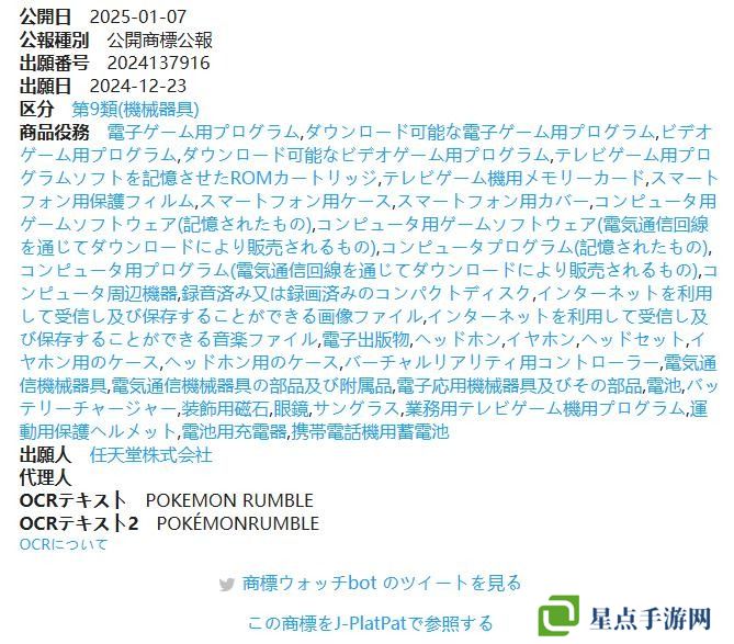 任天堂在2024年12月23日申请了新的商标“Pokémon Rumble”,并已获得日本专利局的批准。