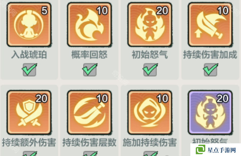 首选是增益选择这个比较重要,主角我们选择刀主,八个增益的选择如下,概率回怒和初始怒气较为重要