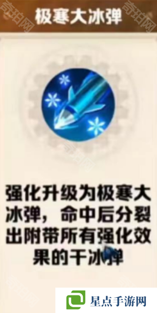 强化升级为极寒大冰弹,命中后分裂出附带所有强化效果的干冰弹,分裂后可以说是满屏的冰弹。局内词条极寒大冰弹伤害不大,要依赖“叠加层数