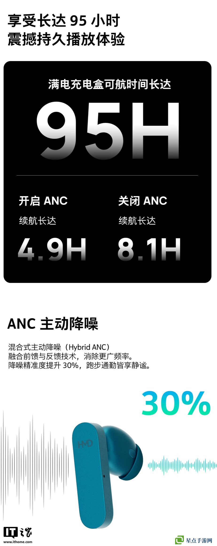 该耳机配备 10mm 动圈,搭载高通 3091 芯片,支持混合ANC / ENC降噪,支持IP54抗水防溅,充电盒配备1600毫安时电池,单耳机配备35毫安时电池,号称搭配充电盒续航至高95小时。
