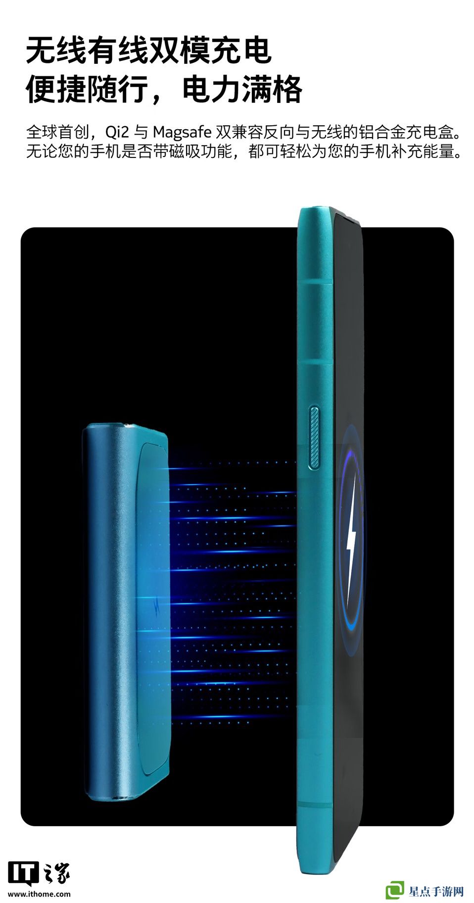 本站获悉,该机最有趣的特性在于其充电盒内置磁吸充电功能,可以吸附在HMD Skyline 或者 iPhone 等手机上为手机反向充电。
