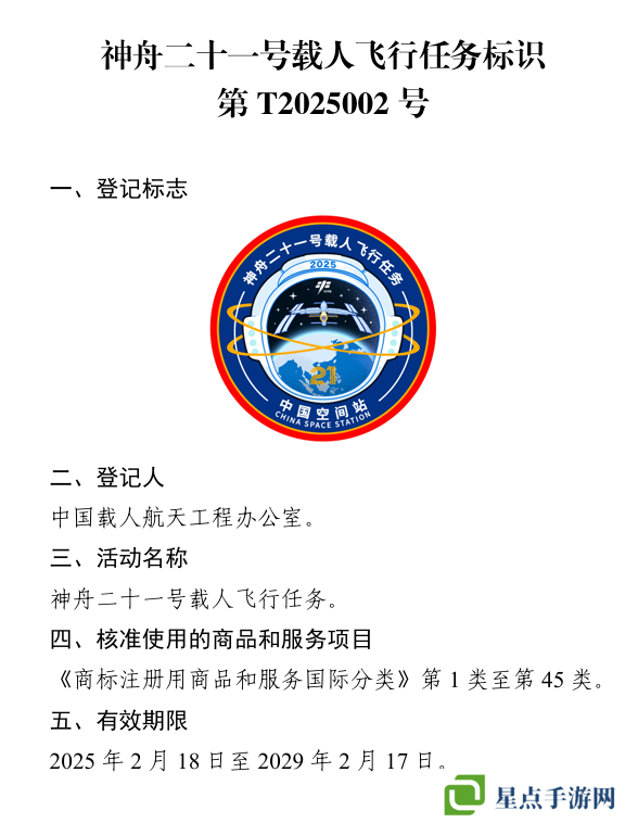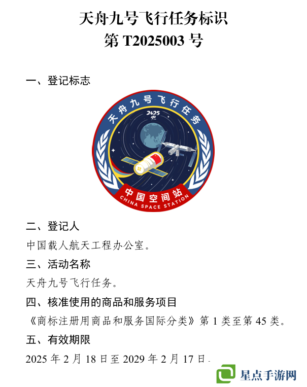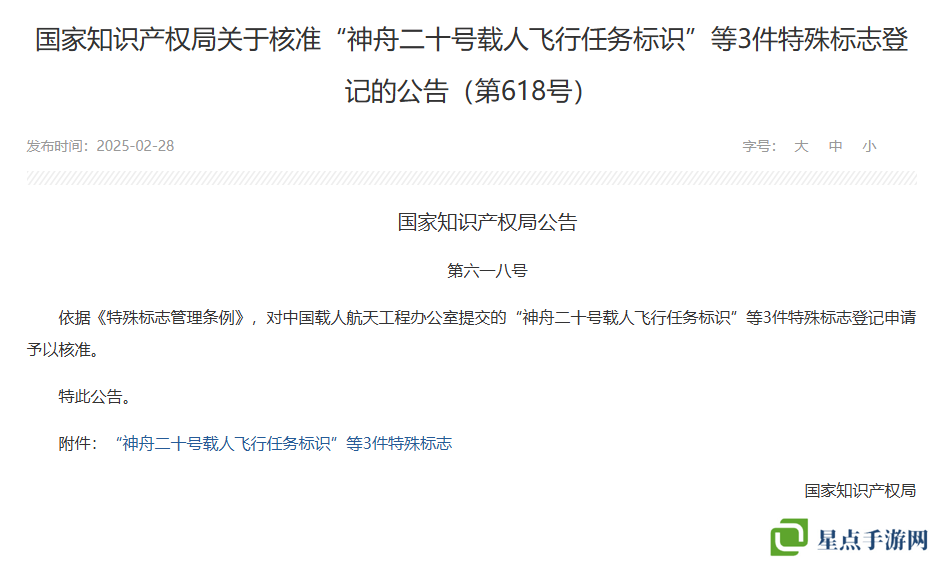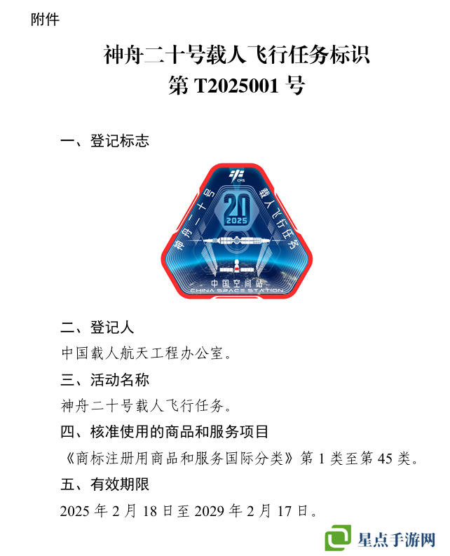 本站 3 月 3 日消息,2 月 28 日,国家知识产权局对中国载人航天工程办公室提交的“神舟二十号载人飞行任务标识”等 3 件特殊标志登记申请予以核准,本站附公告全文如下: