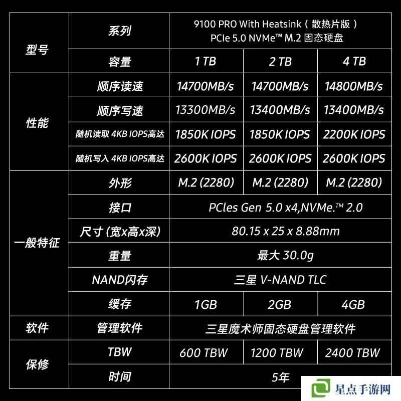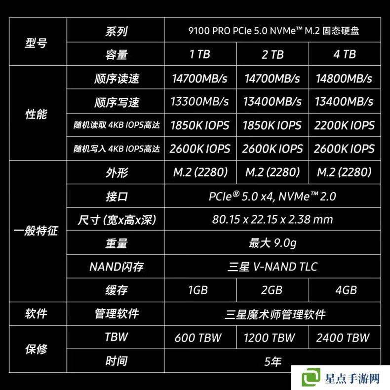 三星 9100 PRO 相比 990 PRO 能效提升高达 49%,可以提供最高14,800 MB/s的顺序读取速度和13,400 MB/s的顺序写入速度;随机读写速度分别为 2,200K IOPS 和 2,600K IOPS。