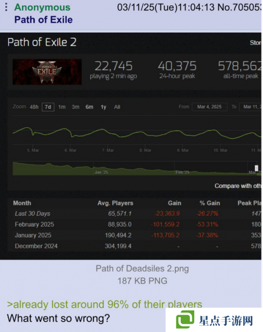 来到本月,《流放之路2》的在线玩家玩家人数仅剩4万左右,不及巅峰时期的十分之一。超过90%的玩家,离开了这款游戏。