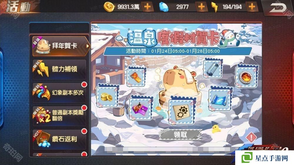 为了即将到来的春节,期间限定主题活动「冬日温泉村」将于 1 月 28 日至 2 月 11 日开放,活动期间玩家可以与拳皇角色们一起乐游温泉度假村,不只签到有奖,也可以透过任务、闯关活动获得各式各样的奖励,也可于专属兑换商店兑换各式好礼如限定头相框,机会难得,快来与拳皇的魅力角色们一起乐游冬日温泉村!