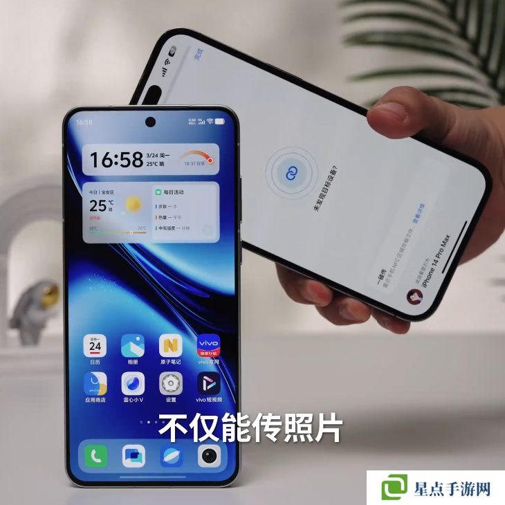 vivo X200s 手机还支持与 iPhone 碰一碰互传 LivePhoto 和文件,同时 iPhone 备忘录能够通过互传 App 分享给 X200s。视频还展示了 vivo X200s 手机的正面形象,其采用窄边框 + 居中单挖孔设计,(预计为视觉四等边设计:上左右三边等宽、下巴稍宽)。