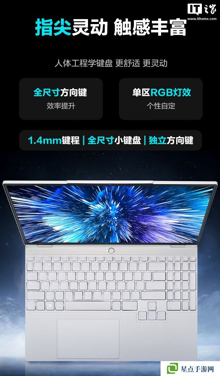 该机使用全金属机身,重约1.71kg,支持180°开合,支持Nahimic声效认证,采用了1.4mm键程人体工程学键盘(独立全高方向键/小键盘设计、单区RGB灯效)。