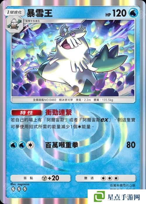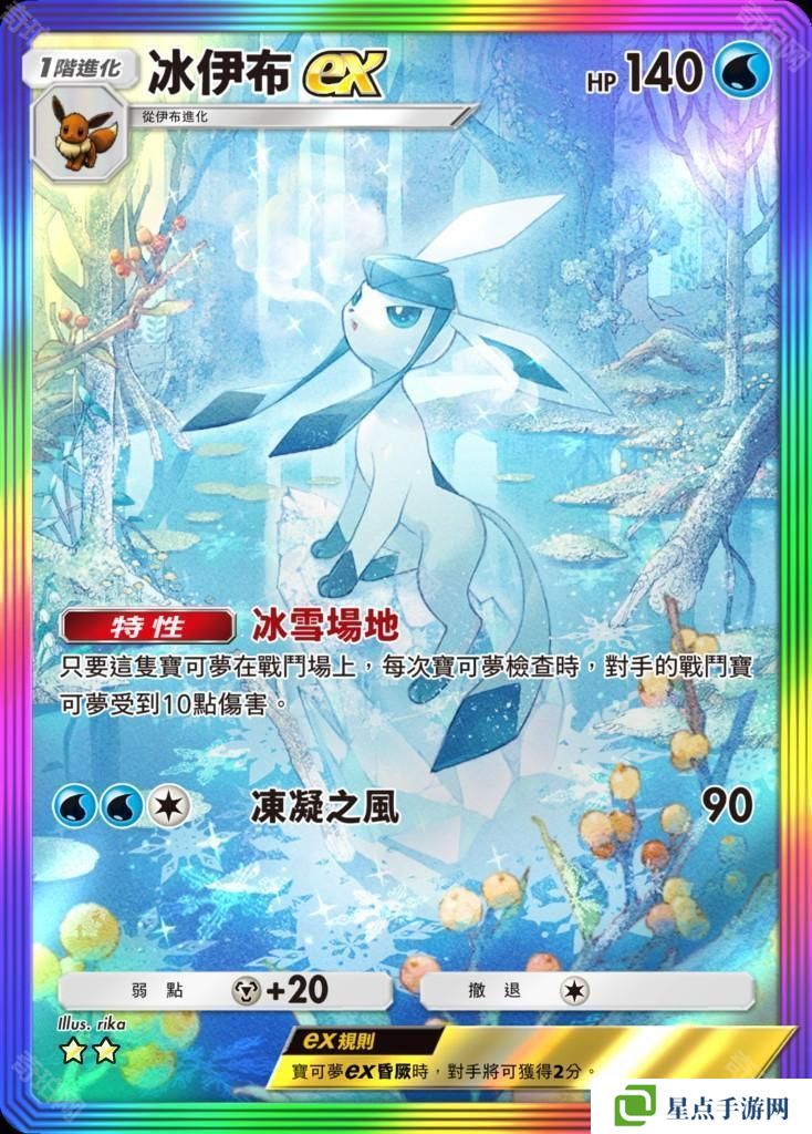 卡牌中描绘了冰伊布伫立在有如幻想世界般的冰雪景色中,十分美丽。