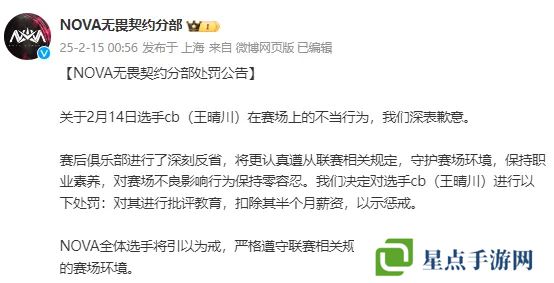 赛后俱乐部进行了深刻反省,将更认真遵从联赛相关规定,守护赛场环境,保持职业素养,对赛场不良影响行为保持零容忍。我们决定对选手cb(王晴川)进行以下处罚:对其进行批评教育,扣除其半个月薪资,以示惩戒。