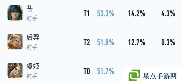 巅峰赛禁选率>5%胜率前三射手英雄: