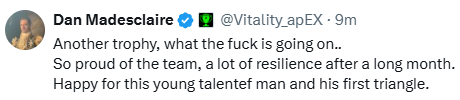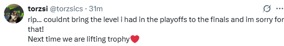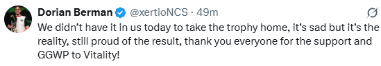 Dorian Berman | xertioN:今天我们终究没能捧起奖杯,虽有不甘,但这就是竞技的现实。依然为这个成绩感到骄傲,感谢所有人的支持——GGWP Vitality!