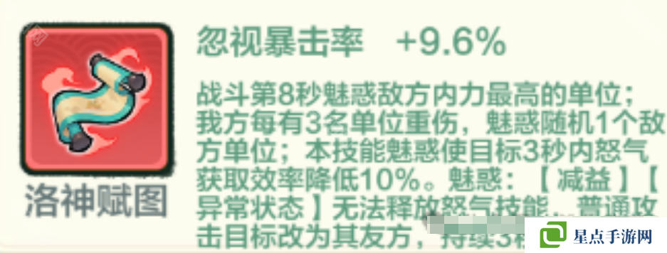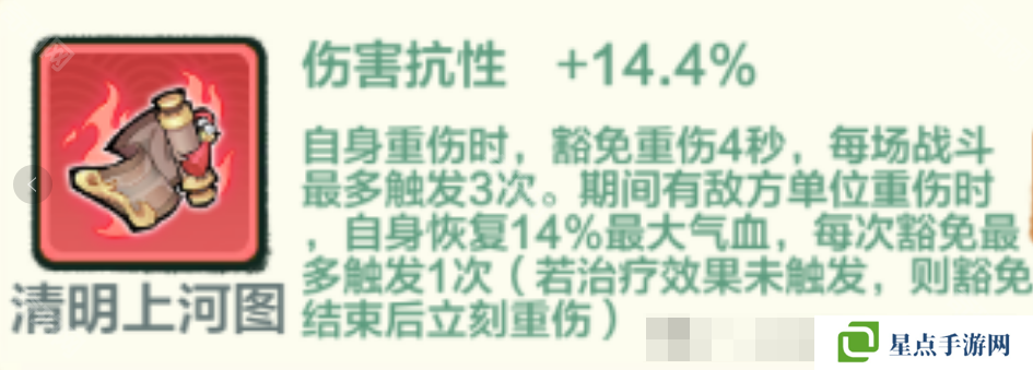 必备的一件藏品,重伤免死4秒,免死期间敌方单位重伤恢复气血且刷新免死效果,每场战斗最多触发三次,我们第一次抽800藏品的时候先把他抽出来或者换出来,不管是PK还是副本都必备的一件藏品