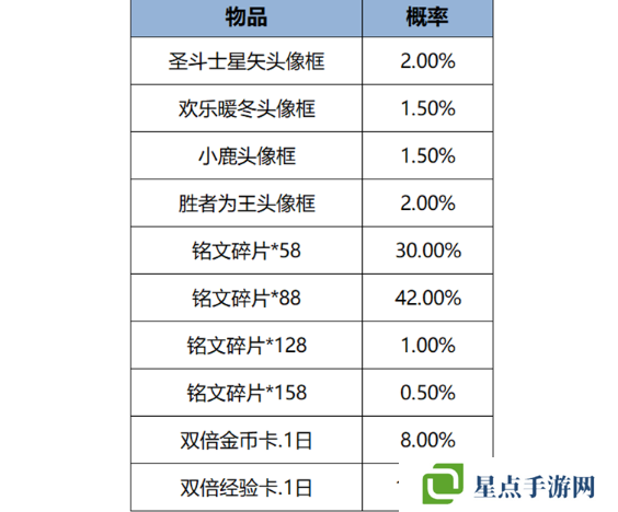 1、打开后可随机获得以下奖励之一:圣斗士星矢头像框、欢乐暖冬头像框、小鹿头像框、胜者为王头像框、双倍金币卡:1日、双倍经验卡:1日、铭文碎片x158/128/88/58。