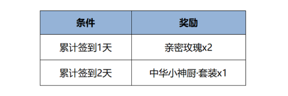 1、活动期间累计签到送中华小神厨套装、亲密度道具好礼。