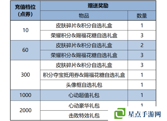 2、皮肤碎片&积分自选礼盒:打开礼包可任意选择以下奖励之一:荣耀积分*10或皮肤碎片*1。